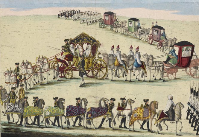 Johann Hieronymus Löschenkohl (1753-1807), L’entrée de l’ambassadeur marocain, Muhamed Ben Abdil Malek, pacha de Tanger, à Vienne le 28 février 1783, Vienne, 1783. Gravure sur cuivre colorisée et disposée sur papier, 38,2 x 55,1 cm (planche), 46 x 61 cm (feuille). Musées de Vienne.