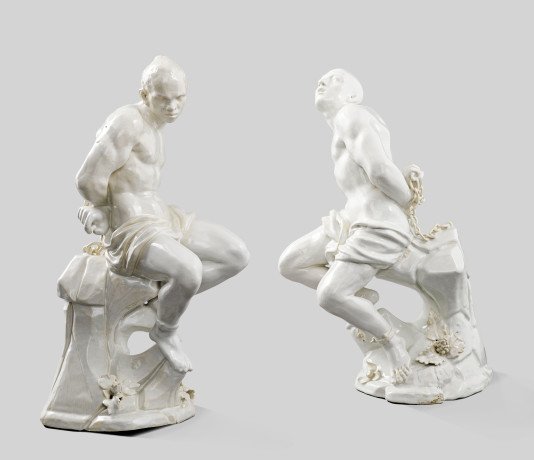 D’après Pietro Tacca (1577-1640), Paire d’esclaves enchaînés, manufacture de Capodimonte, Italie (1743-1759), XVIIIe siècle. Porcelaine tendre, H 43 cm ; L 46 cm. Limoges, musée national Adrien Dubouché.