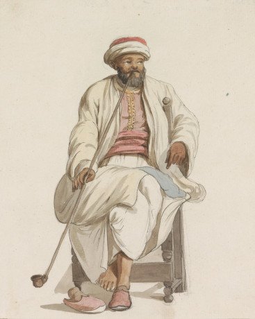 Abraham-Louis-Rodolphe Ducros (1748-1810), Cadi des esclaves turcs à Malte, in album Voyage en Italie, en Sicile et à Malte, 1778. Papier, craie et aquarelle, 19,7 x 15,9 cm. Amsterdam, Rijksmuseum, don de Mme Hansen-van den Brugghen, La Haye.