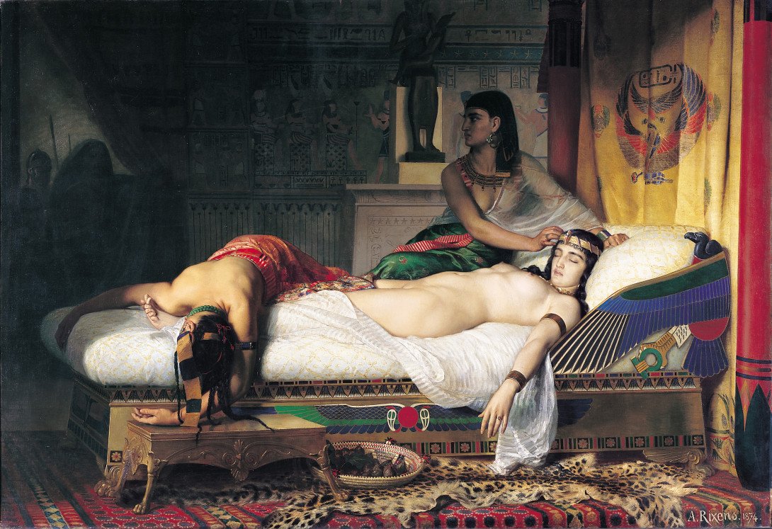 Son suicide, grâce auquel elle échappe à la capture par les Romains, fait naître la Cléopâtre immortelle : la mort héroïque d’une reine séductrice selon les auteurs de l’Antiquité, se révèle une inépuisable source d’inspiration. Enluminures, dessins, peintures, sculptures, littérature, théâtre, opéra… généralisent la légende d’une Cléopâtre tantôt inspirée de l’Ève pècheresse tantôt Orientale perverse.