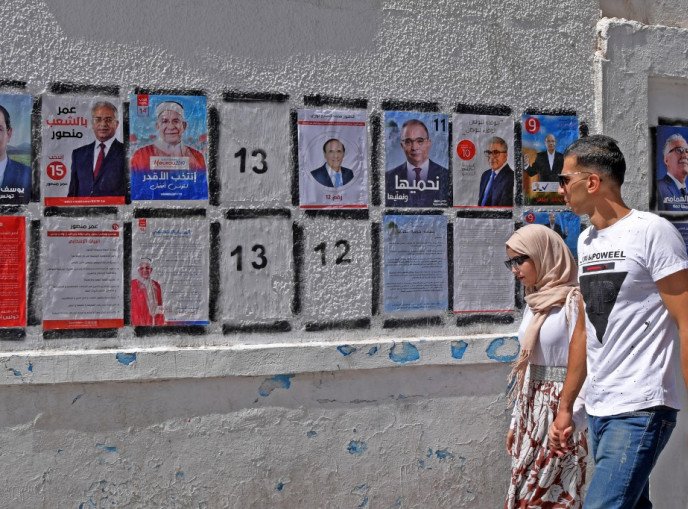 Deux Tunisiens marchent devant les affiches des candidats à l’élection présidentielle à Tunis, le 7 septembre 2019.