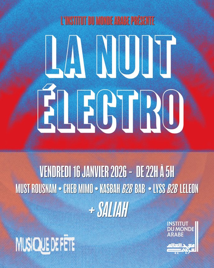 L’Institut du monde arabe est devenu en quelques années l’une des places fortes de la musique électro arabe. En association, pour la troisième fois, avec Musique de Fëte et KasbaH, l’IMA vous invite à une nuit magique peuplée des artistes les plus emblématiques du genre : Must Rousnam, Cheb mimo, KasbaH & BaB, Lyss & LeLeon et Saliah.
