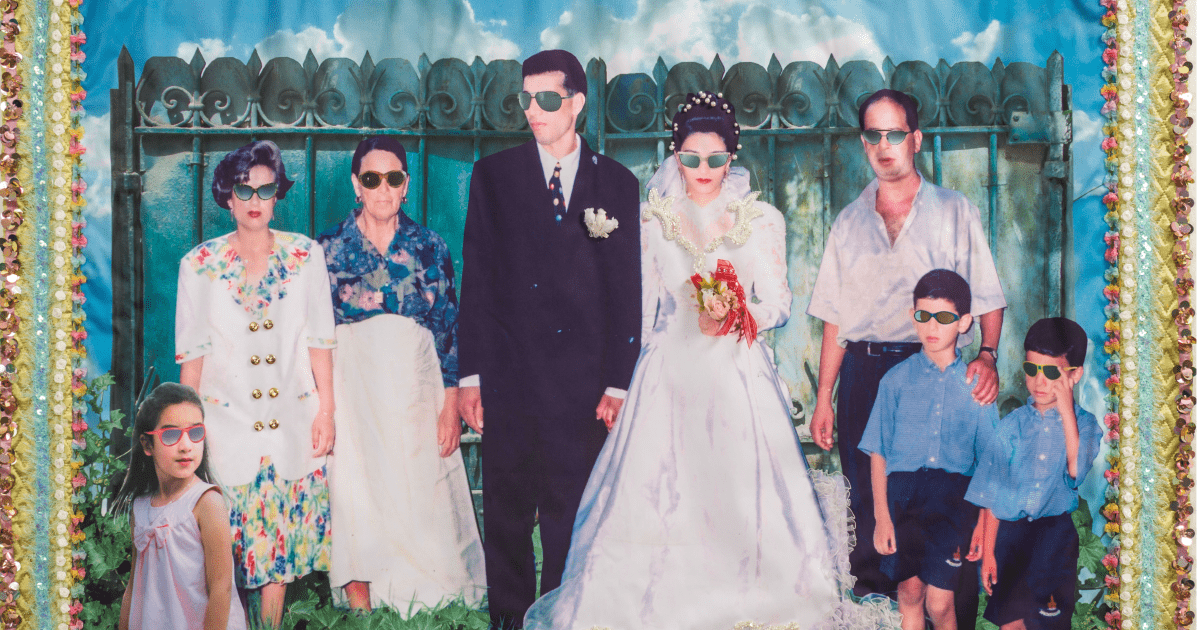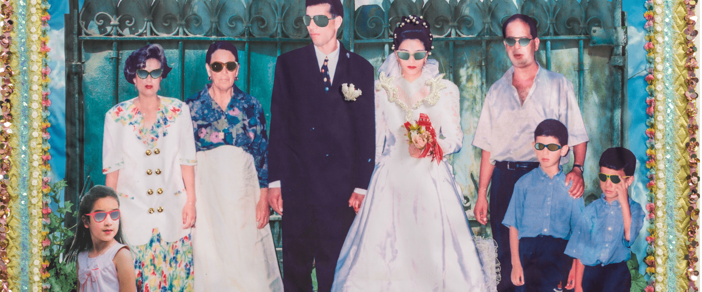 Aïcha Filali (née à Tunis en 1956, vit et travaille à Tunis), Abdelaziz et Sawssen, 2013. Photomontage, techniques mixtes et broderies sur tissu. © Aïcha Filali