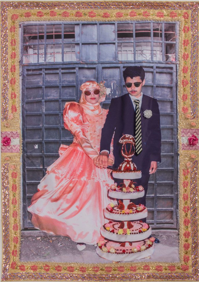 Aïcha Filali (born in Tunis in 1956, lives and works in Tunis), “Abdelaziz and Sawssen”, 2013. Photomontage, mixed media, and embroidery on fabric. © Aïcha Filali