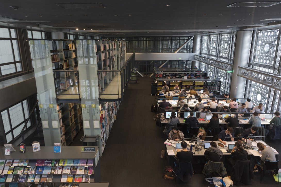 L'espace Découverte accueille régulièrement des événements tels que les Samedis de la poésie, Rencontres littéraires, Jeudis de l'IMA, etc. - Aux niveaux 3 et 5 les espaces Etude et Recherche présentent, dans une magnifique structure de verre et d'acier, les collections plus spécialisées permettant d'approfondir ses recherches, et de travailler dans le calme. Egalement à disposition, un espace Autoformation pour apprendre les langues vivantes du monde arabe et un espace de travail en groupe.