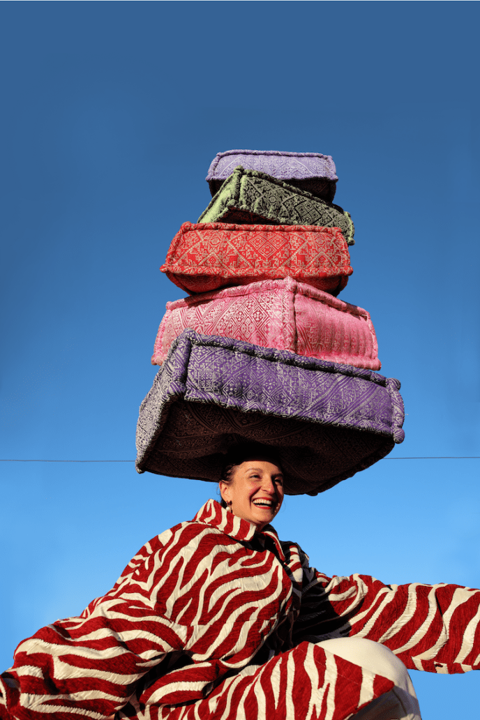 Chaque création est pensée localement et cocréée avec des artisans entre Fès et Rabat. Zoubida bouscule les codes de l’industrie : pas de saison ni de collection, mais des pièces « d’art-à-porter » unisexes empreintes d’une joie de vivre contagieuse.