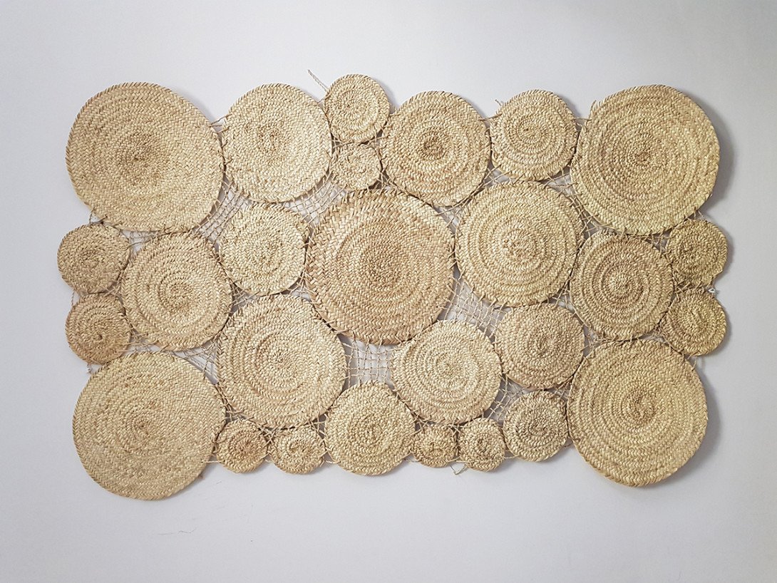 Une collection de nattes et paniers en jonc tressé, agrémentés, pour les paniers d’une lanière en cuir lisse à tannage végétal. Ces produits sont fabriqués par Nanou, un artisan de Nabeul qui tresse le jonc depuis son enfance, savoir- faire qu’il a acquis auprès de maîtres-nattiers de sa ville natale.