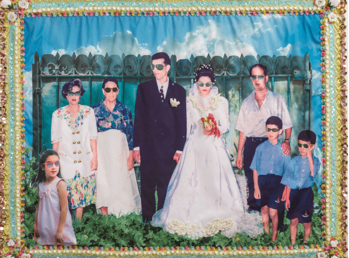Aïcha Filali (née à Tunis en 1956, vit et travaille à Tunis), Mondher et Amel, 2013. Photomontage, techniques mixtes et broderies sur tissu. © Aïcha Filali